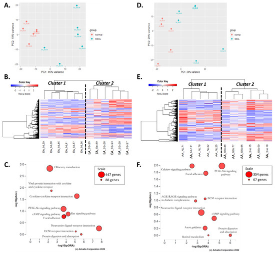 Results of the differential expression analyses “SScL vs. NL” in EA and AA. (A) PCA plot for “EA-SScL vs. EA-NL” DE analysis. (B) Heatmap of the genes with a q-value < 0.1 in the “EA-SScL vs. EA-NL” DE analysis. (C) Perturbation versus over-representation pathway plot for “EA-SScL vs. EA-NL” DE analysis. (D) PCA plot for “AA-SScL vs. AA-NL” DE analysis. (E) Heatmap of the genes with a q-value < 0.1 in the “AA-SScL vs. AA-NL” DE analysis. (F) Perturbation versus over-representation pathway plot for “AA-SScL vs. AA-NL” DE analysis. For panels (C,F): dots representing the top 10 impacted pathways are positioned by their p-values from the impact analysis measuring total perturbation accumulation (pAcc) and from the classic over-representation analysis (pORA). Red: significant combined p-values. The size of each dot denotes the total number of genes in the corresponding KEGG pathway (for visualization, this number is log(2) scaled).