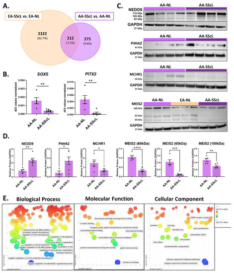 Defining unique disease mechanisms in AA-SScL fibroblasts. (A) Venn diagram for the DEGs from the comparisons “SScL vs. NL” in the fibroblasts of SSc-PF AA and EA patients. At the intersect, 212 DEGs are commonly deregulated in both races, while 2322 DEGs are unique to EA-SScL fibroblasts, and 275 DEGs are unique to AA-SScL fibroblasts. (B) Expression levels of SOX5 and PITX2 in AA-NL and AA-SScL fibroblasts. (C) Representative Western blots for NEDD9 (three bands), P4HA2, MCHR1, and MEIS2 (three bands). (D) Quantification of protein abundance of NEDD9 (three bands quantified together), P4HA2, MCHR1, and MEIS2 (three bands quantified separately) in the lysates of AA-SScL fibroblasts compared to AA-NL fibroblasts normalized to GAPDH loading control. (E) GO terms obtained from ToppFun for the 275 DEGs unique to AA-SScL fibroblasts were entered in REViGO. The scatter bubble plots for Biological Process, Molecular Function, and Cellular Component terms are shown here. Terms in blue and at the bottom of the scatterplot are more enriched than those in red. Only the most enriched terms are labeled in the scatterplot. The bubble color indicates the log10 p-value obtained from the ToppFun output. Bubble size indicates the frequency of the GO term in the underlying database, and thus more general terms are larger. The coordinate axes have no intrinsic meaning as REViGO uses multi-dimensional scaling to reduce the dimensionality of a matrix of the GO terms’ pairwise semantic similarities. * p ≤ 0.05, ** p ≤ 0.01, *** p ≤ 0.001, **** p ≤ 0.0001. Mean ± SEM.