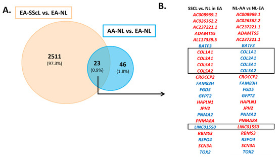 We were intrigued by the detection of more DEGs in EA-SScL vs. EA-NL fibroblasts (2511 DEGs) than in AA-SScL vs. AA-NL fibroblasts (487 DEGs), as well as the 69 DEGs in AA-NL compared to EA-NL fibroblasts. Therefore, we examined the possibility of a disease-like signature in AA-NL by comparing the 69 DEGs in AA-NL fibroblasts to the 2511 DEGs in EA-SScL fibroblasts (Figure 4A and Figure S1D). We identified 23 DEGs commonly deregulated (intersect) in AA-NL and EA-SScL fibroblasts (0.9% of all genes entered in this Venn analysis), out of which 18 had the same direction of regulation (Figure 4B): ADAMTS5, CROCCP2, HAPLN1, JPH2, PNMA8A, RBMS3, SCN3A, and four not-yet-defined nucleotide sequences were upregulated, and BATF3, FAM83H, FGD5, GFPT2, PNMA2, RSPO4, and TOX2 were downregulated. HAPLN1 and RBMS3 were quantified by immunoblotting in the lysates of AA-NL and EA-NL fibroblasts (Figure 1E,F). Note that COL1A1, COL3A1, COL5A1, COL5A2, and LINC01550 were deregulated in the opposite direction of regulation in AA-NL and EA-SScL fibroblasts (box in Figure 4B). Together our data suggest that AA-NL fibroblasts have a transcriptomic signature that holds several characteristics reminiscent of the pathological signature observed in EA-SScL fibroblasts, suggesting a propensity for molecular activation which may explain some of the racial disparity observed in SSc-PF.