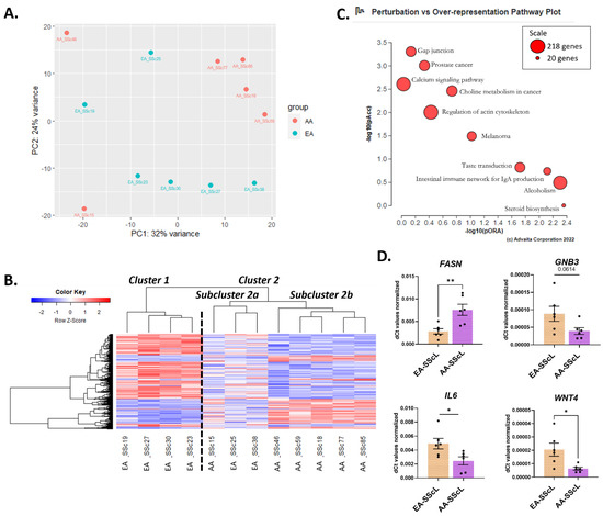 Characterizing the differences in disease state between AA and EA SScL fibroblasts. (A) PCA plot for “AA-SScL vs. EA-SScL” DE analysis. (B) Heatmap of the genes with a q-value < 0.1 in the “AA-SScL vs. EA-SScL” DE analysis. (C) Perturbation vs. over-representation pathway plot for “AA-SScL vs. EA-SScL.” Dots representing the top 10 impacted pathways are positioned by their p-values from 2 different analyses: the impact analysis (pAcc) vs. over-representation analysis (pORA). The size of each plot denotes the total number of genes in the corresponding KEGG pathway (for visualization, this number is log(2) scaled). (D) Validation of selected genes by qPCR in EA-SScL and AA-SScL samples. * p ≤ 0.05, ** p ≤ 0.01. Mean ± SEM.