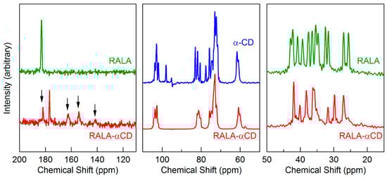 13C-CP/MAS NMR spectra of the crystalline R(+)-α-Lipoic Acid (RALA)-αCD complex, free α-CD, and free RALA, recorded at 6 kHz spinning frequency. The arrows indicate the spinning side bands Adapted from [18], licensed under CC BY 4.0. [18].