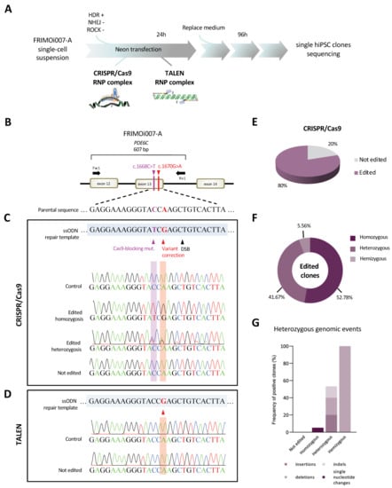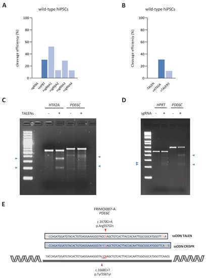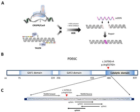 According to the HGMD database, there are more than 70 variants in PDE6C described as damaging []. Single-base substitutions—missense, nonsense, and splicing-related—account for more than 85% of the PDE6C mutations. Conversely, small deletions, insertions, or duplications comprise only 13% of the pathogenic variants []. In an attempt to correct a human pathogenic missense PDE6C variant, we performed single-stranded oligodeoxynucleotide (ssODN)-mediated gene editing by CRISPR/Cas9 and TALEN technologies (Figure 1A).