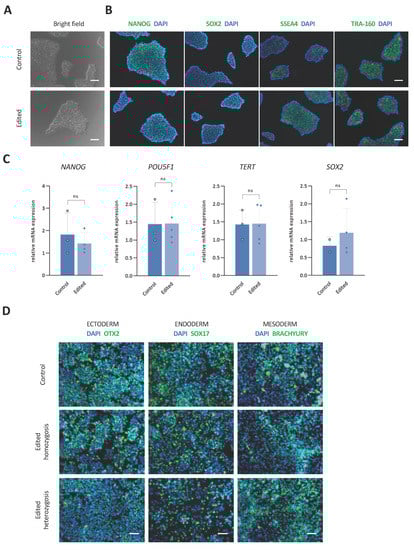To assess whether gene editing compromised the ability of hiPSCs to differentiate into the three germ layers, we subjected edited clones to ectodermal, endodermal, and ectodermal lineages and analyzed them for the expression of OTX2, SOX17, and BRACHYURY differentiation markers, respectively. Immunofluorescence results showed no significant differences in the expression of these markers when compared with control clones (Figure 4D).