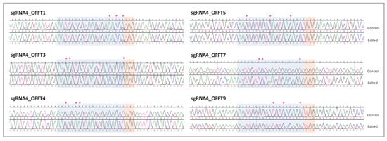 Off-targets could generate undesired genomic alterations in other regions of the genome due to unintended DNA recognition; their detection could be difficult or ignored. In silico analysis of sgRNA4 predicted no off-target regions with fewer than three mismatches throughout the genome. Importantly, none of the off-targets with three mismatches corresponded to exonic regions (Table S1). Thus, we decided to analyze all intronic off-targets with three mismatches in all homozygous edited clones by Sanger sequencing (as specified in Table S1). We screened approximately 500 bp surrounding the six off-targets and checked the homologous sequence and the adjacent PAM motif for each one (Figure 5). Accurate analysis of these loci revealed that these edited clones had no genomic alterations (insertions, deletions, indels, or single-base modifications) in the ~500 bp homologous region analyzed, in comparison with control clones (Figure 5).