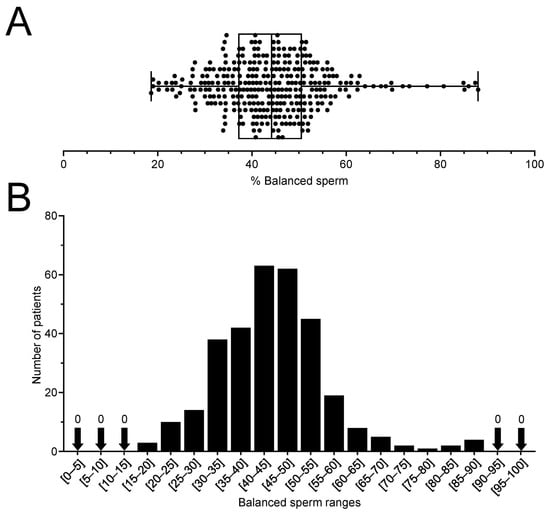 Segregation rates of our 41 patients are provided in Table 1 with balanced sperm rates ranging from 27.83 to 69.75%. The average rate of balanced gametes among all 318 patients (our patients and 277 literature patients) is 44.26% ± 8.64% (min 18.6–max 88). Balanced rates dispersion (Figure 1A,B) reveals that most (85%) of the RT carriers display a 30–60% rate, with only 3 patients (0.9%) producing less than 20% of balanced sperm, although with a rate only slightly reduced as it remained between 18–20%. On the other side of the spectrum, only 6 patients (1.9%) of carriers surpassed the ≥80% of balanced sperm. Interestingly, no carriers displayed extreme segregation rates presenting ≤15% or ≥90% of balanced rates.