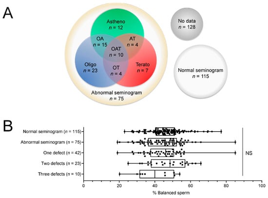 Relationship between balanced sperm rates and the number of sperm parameter defects. (A) Graphical representation of the different patient populations according to their sperm parameters. (B) Box-and-whisker plot of balanced sperm rates according to individual seminogram results with each data point displayed as a dot. The boxes represent the interquartile range with the median as the box centerline and 1st and 3rd quartile at the low and high box lines. The whiskers represent the minimum and maximum values. n is the number of patients, NS—not significant. Corresponding statistical data can be found in the Supplementary Materials Table S1.