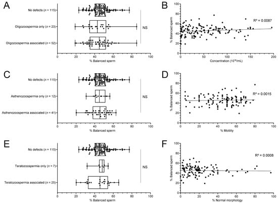 No correlation observed between balanced sperm rates and sperm parameters. Concentration (A,B), motility (C,D), and morphology (E,F) parameters are not correlated with the rate of balanced sperm in RT carriers, whether each parameter is considered alone or associated with others. NS—not significant. Corresponding statistical data can be found in Supplementary Materials Tables S2–S4.