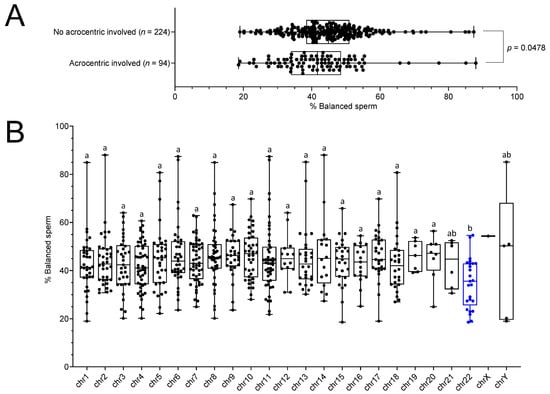 Acrocentric chromosomes, especially 22, reduce the balanced sperm rates. The rate of balanced cells is reduced (A) when an acrocentric chromosome is involved in the translocation, (B) especially chromosome 22 (blue) whose presence is associated with higher rates of imbalance. Each chromosome was compared individually with all other chromosome one by one. For each chromosome, plots sharing different small letters represent statistically significantly differences between the groups (p < 0.05), and plots with a common letter do not present statistically significantly differences between the groups (p > 0.05). Corresponding statistical data can be found in the Supplementary Materials Tables S5 and S6.
