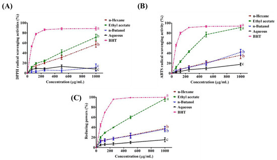 The antioxidant activities of 75% methanol crude extract and its different solvent partitions including n-hexane, ethyl acetate, n-butanol and water from freeze-dried powder of Phellinus linteus mycelia. Each value represents the mean ± standard deviation (SD, n = 3) SD of triplicate experiments. (A) DPPH radical scavenging activity, (B) ABTS radical scavenging activity and (C) reducing power on ferric ions. Means with different letters are significantly different (p < 0.05).