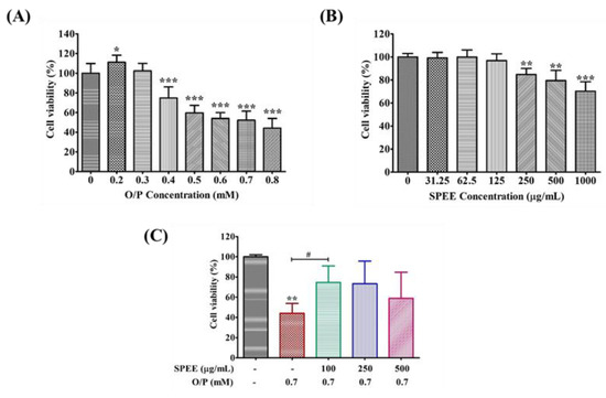 The effects of O/P SPEE and their combined treatments on HepG2 cell proliferation at 24 hr. (A) The viability of HepG2 cells. (B) The cytotoxicity of SPEE on HepG2 cells. (C) The rescue of HepG2 cells treated with O/P 0.7 mM by SPEE within a dose range of 100 to 500 μg/mL. Data are expressed as mean ± SD from triplicate experiments (n = 3). The Student’s t-test was used to compare the means between two groups. * p < 0.05, ** p < 0.01, *** p < 0.001 vs. the control group. # p < 0.05 vs. the O/P group.