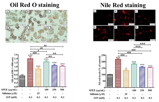 The effects SPEE on O/P-induced intracellular lipid accumulation analyzed by Oil Red O staining and Nile red staining in HepG2 cell. HepG2 cells were co-treated with 0.3 mM O/P and SPEE at 100, 150 and 500 μg/mL, respectively, for 24 h. Silibinin (25 μM) was used as the positive control. Oil-Red-stained cells were observed under inverted microscope and Nile-red-stained cells were assessed by phase-contrast fluorescence microscopy (magnification, ×200). (A) Control, (B) O/P 0.3 mM, (C) O/P 0.3 mM + Silibinin 25 µM, (D) O/P 0.3 mM + SPEE 100 μg/mL, (E) O/P 0.3 mM + SPEE 250 μg/mL and (F) O/P 0.3 mM + SPEE 500 μg/mL. Values are expressed as the mean ± SD (n = 3). * p < 0.05 and *** p < 0.001 vs. the control group. # p < 0.05, ## p < 0.01 and ### p < 0.001 vs. the O/P group. && p < 0.01 and &&& p < 0.001 vs. the O/P 0.3 mM + SPEE 100 μg/mL group.