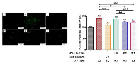 The effects SPEE on O/P-induced intracellular reactive oxygen species (ROS). HepG2 cells were co-treated with 0.3 mM O/P and SPEE at 100, 150 and 500 μg/mL, respectively, for 24 h. Silibinin (25 μM) was used as the positive control. Intracellular ROS were assessed using DCFH-DA fluorescence staining and were observed by phase-contrast fluorescence microscopy (left panel, original magnification ×100). (A) Control, (B) O/P 0.3 mM, (C) O/P 0.3 mM + Silibinin 25 µM, (D) O/P 0.3 mM + SPEE 100 μg/mL, (E) O/P 0.3 mM + SPEE 250 μg/mL and (F) O/P 0.3 mM + SPEE 500 μg/mL. Values are expressed as the mean ± SD (n = 3, right panel). * p < 0.05 and ** p < 0.01 vs. the control group. # p < 0.05 and ### p < 0.001 vs. O/P group. && p < 0.01 and &&& p < 0.001 vs. O/P 0.3 mM + SPEE 100 μg/mL group.