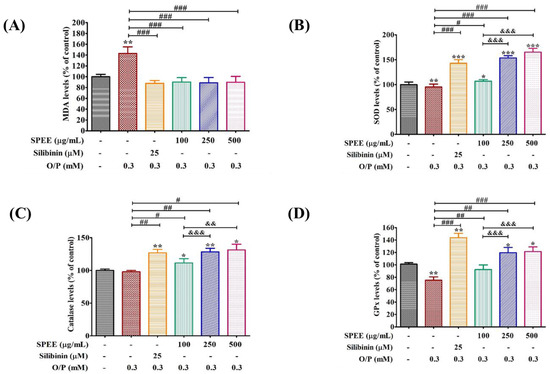 The effects of SPEE on O/P-inhibited antioxidant activities in HepG2 cells. HepG2 cells were co-treated with 0.3 mM O/P and SPEE at 100, 250 and 500 μg/mL for 24 h. SPEE inhibited the O/P-induced MDA production (A), and increased the antioxidant enzyme activities of SOD (B), catalase (C) and GPx (D). Silibinin (25 μM) was used as the positive control. Values are expressed as mean ± SD from triplicated experiments (n = 3). * p < 0.05, ** p < 0.01 and *** p < 0.001 vs. the control group. # p < 0.05, ## p < 0.01 and ### p < 0.001 vs. the O/P group. && p < 0.01 and &&& p < 0.001 vs. the O/P 0.3 mM + SPEE 100 μg/mL group.