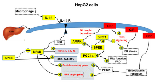 O/P insults HepG2 cell to induce ROS signaling via ER stress associated with oil droplet deposition, which enhances energy stress and upregulates AMPK, Sirt1 and, subsequently, PGC1-α. SPEE further upregulates AMPK, Sirt1 and PGC1-α. Simultaneously, O/P stimulates macrophage to produce IL-1β, which activates NFκB to upregulate antioxidant and pro-inflammatory cytokines TNF-α, IL-6 and IL-1β. On the other hand, O/P may upregulate PERK which in turn upregulates the pro-inflammatory genes and UPR target genes. SPEE downregulated pro-inflammatory cytokines; conversely, it upregulated the antioxidant enzymes’ activities. Finally, the upregulated PGC1-α improved the mitochondrial function (Mito function) and fatty acid oxidation (FAO). Items with dotted lines and dotted boxes are depicted from the literature and were not included in this experiment.