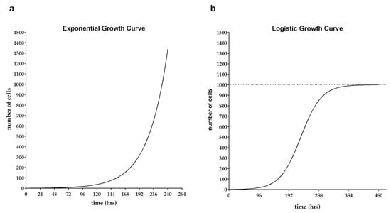 Models of the growth curves: (a) exponential growth curve; (b) logistic growth curve. (a) The exponential growth curve was modeled in GraphPad Prism 6 software (Dotmatics, Boston, MA, USA) using Plot a function analysis using the Exponential growth equation with the following parameters: P(0) = 1; k = 0.03 (k was derived from Equation (14) with the doubling time D equal to 24 h). (b) The logistic growth curve was modeled in GraphPad Prism 6 software (Dotmatics, Boston, MA, USA) using Plot a function analysis using the Logistic growth equation with the following parameters: P(0) = 1; k = 0.03 (k was derived from Equation (14) with the doubling time D equal to 24 h; K = 1000, where K is the maximum cell population).