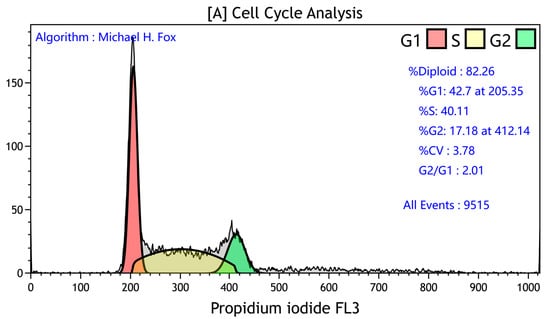 Various approaches are used to identify the distinct cell cycle phases. The approach that is likely the most frequent is based on the analysis of DNA content. The cells in G1 and G0 have half the content of DNA as compared to G2 and M cells. During determination of the amount of DNA, DNA is stained by fluorescent dyes, and the fluorescent signal is analyzed. The histogram of DNA content thus enables the estimation of the number of cells in G1/G0, S, and G2/M phases. The most frequently used protocols for DNA staining of fixed cells are based on the use of fluorescent, stoichiometrically DNA binding dyes such as propidium iodide (PI, Figure 3), 4,6-diamidino-2-phenylindole (DAPI), Hoechst 33258, or Hoechst 33342 [30]. For the staining of the living cells, Hoechst 33342 is commonly used [31]. As PI also stains RNA, the protocols based on PI also include the step with the treatment of cells with RNase [32]. As the cells with the same DNA content can differently bind fluorescent dyes to their DNA [33], DNA content does not allow easy discrimination between the G1/G0, S, and G2/M phases. Thus, mathematical approaches were developed for the estimation of fractions of cells in the G1/G0 phases, S phase, and G2/M phases [34,35,36,37,38].