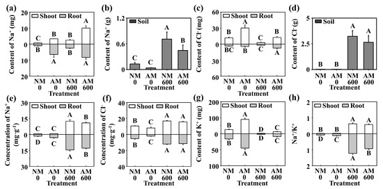Effect of R. irregularis on Na+, K+, and Cl− status under NaCl stress. (a) The content of Na+ in C. glauca. (b) The content of Na+ in soil. (c): The content of Cl− in C. glauca. (d) The content of Cl− in soil. (e) The concentration of Na+ in C. glauca. (f) The concentration of Cl− in C. glauca. (g) The content of K+ in C. glauca. (h) The Na+/K+ of C. glauca. NM, nonmycorrhizal; AM, inoculated with R. irregularis; 0, no NaCl stress; 600, 600 mM NaCl stress. The data are the means ± standard errors (n = 3). Different capital letters indicate significant differences between means at the p < 0.05 level by Tukey’s test. Data of roots from Wang et al. [31] in the same project.