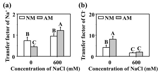 The transfer factor (TF) of Na+ and Cl− in C. glauca under different treatments. (a) The TF of Na+ in C. glauca. (b) The TF of Cl− in C. glauca. NM, nonmycorrhizal; AM, inoculated with R. irregularis; 0, no NaCl stress; 600, 600 mM NaCl stress. The data are the means ± standard errors (n = 3). Different capital letters indicate significant differences between means at the p < 0.05 level by Tukey’s test.