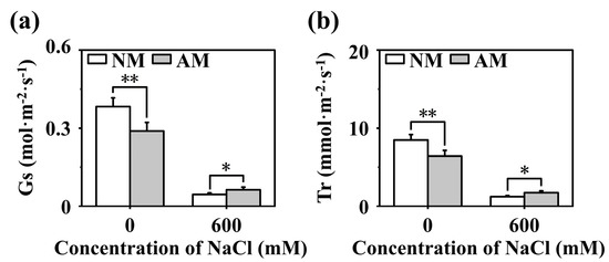 The stomatal conductance (Gs) and transpiration rate (Tr) in leaves of C. glauca in different treatments. (a) The Gs in leaves of C. glauca in different treatments. (b) The Tr in leaves of C. glauca in different treatments. NM, nonmycorrhizal; AM, inoculated with R. irregularis; 0, no NaCl stress; 600, 600 mM NaCl stress. The data are the means ± standard errors (n = 3). * indicates significant differences between means at the p < 0.05 level by one-way ANOVA, and ** indicates significant differences between means at the p < 0.01 level by one-way ANOVA.