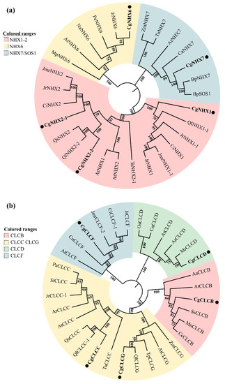 Phylogenetic tree of NHX and CLC protein translated from cloned genes. (a) Phylogenetic tree of NHX protein. (b) Phylogenetic tree of CLC protein. The genes marked by black dots are the target genes of the study. The NCBI number of the cloned gene is as follows: ON246321 (CgNHX1), ON246322 (CgNHX2-1), ON246323 (CgNHX2-2), ON246324 (CgNHX6), ON246325 (CgNHX7), ON206670 (CgCLCB), ON246326 (CgCLCC), ON246328 (CgCLCD), ON246329 (CgCLCF), ON246330 (CgCLCG). The sequences of Actinidia rufa, Arabidopsis thaliana, Artemisia annua, Betula platyphylla, Carya illinoinensis, Citrus clementina, Cocos nucifera, Cucurbita argyrosperma, Juglans microcarpa × Juglans regia, Juglans regia, Morella rubra, Morus notabilis, Mucuna pruriens, Nicotiana attenuate, Oryza sativa, Populus euphratica, Prosopis alba, Quercus lobata, Quercus suber, Senna tora, Spatholobus suberectus, Trifolium pratense, Triticum aestivum, Triticum Urartu, Zea mays used for phylogenetic tree building were all from NCBI.