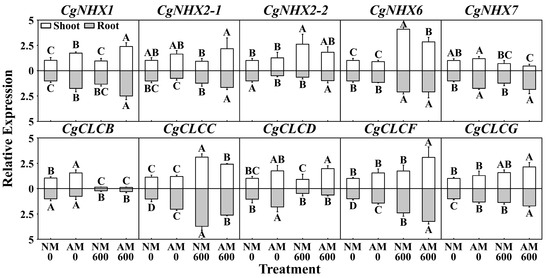 Effects of NaCl stress and R. irregularis inoculation on the expression of CgNHXs and CgCLCs in shoots and roots. NM, nonmycorrhizal; AM, inoculated with R. irregularis; 0, no NaCl stress; 600, 600 mM NaCl stress. Different capital letters indicate significant differences between means at the p < 0.05 level by Tukey’s test.