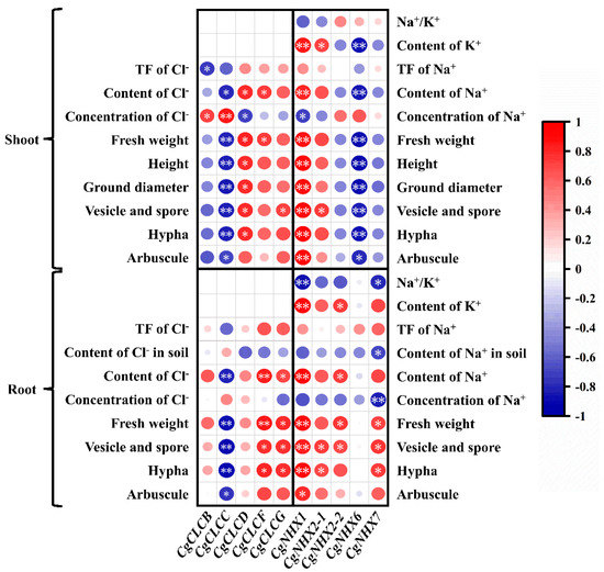 Correlation coefficients of gene expression and physiological indices of C. glauca under NaCl stress. Each circle indicates Pearson’s correlation coefficient of a pair of parameters. * indicates a significant difference between the correlation coefficients at the p < 0.05 level, ** indicates a significant difference between the correlation coefficients at the p < 0.01 level.