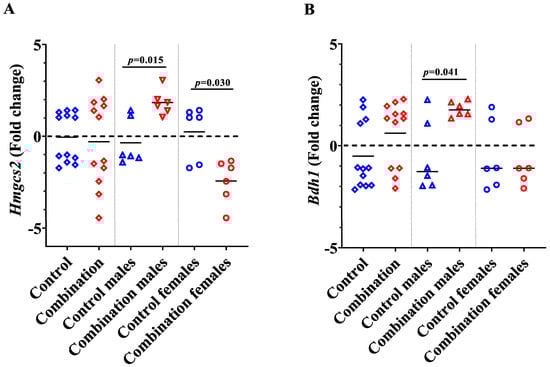 2.2. Maternal Diabetes + HFD Dysregulates Genes Involved in Myocardial Ketone Body Metabolism in a Sex-Divergent Manner