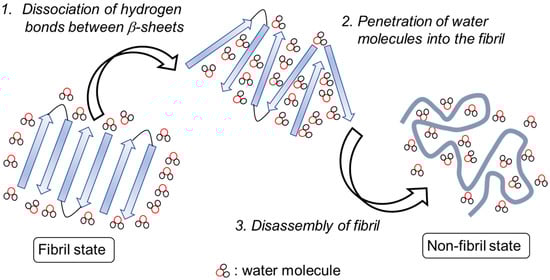 - Okumura, H.; Itoh, S.G.; Nakamura, K.; Kawasaki, T. Role of Water Molecules and Helix Structure Stabilization in the Laser-Induced Disruption of Amyloid Fibrils Observed by Nonequilibrium Molecular Dynamics Simulations. J. Phys. Chem. B 2021, 125, 4964–4976. [Google Scholar] [CrossRef] [PubMed]