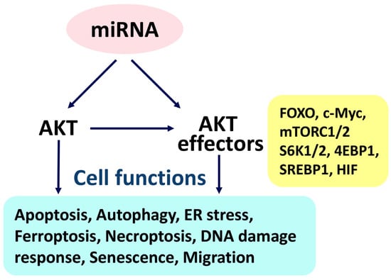 The various noncoding RNAs (ncRNAs), such as lncRNAs and circular RNAs, targeting AKT and its effectors in the regulation of a range of cell functions are well-reviewed [,]. However, the connections involving other ncRNAs, such as between miRNAs and AKT/AKT signaling, lack comprehensive and systemic integration. Recently, the impact of miRNAs in the regulation of AKT signaling has been reported in several cancer studies, such as for breast [], glioblastoma [], and nasopharyngeal [] cancer cells. Moreover, miRNA and AKT signaling exhibit a reciprocal interaction in cancer cells []. Consequently, this review explored the relationship between miRNAs, AKT, and AKT effectors in connection to cell functions (Figure 1).