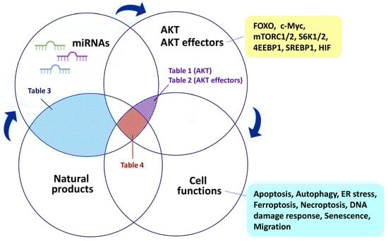 As mentioned, several miRNAs modulating cell functions have been reviewed in detail. However, the involvement of AKT serine-threonine kinase (AKT; protein kinase B (PKB)) and its effectors is less studied and the research lacks systemic organization. We introduce here the AKT (Section 2) and AKT effectors (Section 3) to connect the miRNA-mediated regulation of cell functions. The impacts of miRNAs (Section 4) and AKT- and AKT effector-targeting miRNAs (Section 5) on the treatment of cancer cells with natural products are particularly emphasized.