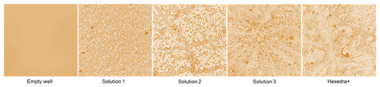 One of the properties of UA reported in the literature is based on its mechanical ability to modify its structure by creating a branch that can form a protective barrier against several pathogens. As reported in Figure 1, this ability becomes visible at 3 h, confirming that the preparations can build the barrier when UA is placed at 37 °C for about 3 h and that this barrier remains anchored to the support. However, it is very delicate and can be easily removed when washed. As can be seen, the complete formulations that have been tested (Solution 1, 2, 3, and HEXEDRA+) create different crosslinkers with dissimilar porosity, probably due to the different composition (in addition to UA there is also the presence of TPmix in HEXEDRA +). Furthermore, the amount of the UA is also important to create the barrier. In fact, as revealed by Solution 2 and Solution 3, the balance between UA and HPMC is important to create more ramifications, and this improves the trapping property of the final formulation. Therefore, the preparation HEXEDRA+ not only possesses the branching capacity of UA but possesses a different conformation with a denser network and broad branches in places, making it suitable to be formulated as a medical device.