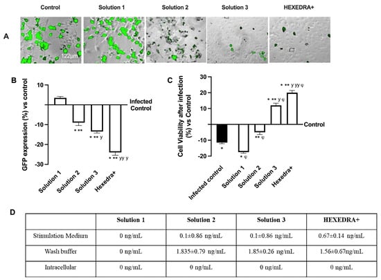 Analysis of infection of Vero E6 cells with VSV-based pseudovirus SARS-CoV-2 (MOI 0.1) pre-treated with the different UA-based formulations. In (A), the images reported were an example of each stimulation for GFP fluorescence expression obtained at 40× magnification by Paula (Leica DM1000); in (B) the analysis of GFP expression in cells obtained by the image analysis using Image J Software and the results were expressed as mean ± SD (%) compared to infected control cells (0 line) of four independent experiments. In (C), cell viability measured by MTT test after infection and expressed as mean ± SD (%) compared to uninfected control cells (0 line) obtained from four independent experiments. In (D) UA spectrophotometry quantification at 281 nm by Tecan (Infinite 200 Pro Mplex, Tecan, Milan, Italy) and data are expressed as ng/mL ± SD of four independent experiments. Solution 1 = 150 mcg/mL β-CD +HPMC; Solution 2 = 150 mcg/mL UA+ 150 mcg/mL β-CD + 1% HPMC; Solution 3 = 75 mcg/mL UA+ 150 mcg/mL β-CD + 1% HPMC; HEXEDRA+ = 75 mcg/mL UA+ 150 mcg/mL β-CD + 0.1% Tpmix + 1% HPMC. * p < 0.05 vs. Control; ** p < 0.05 vs. Solution 1; y p < 0.05 vs. Solution 2; yy p < 0.05 vs. Solution 3; φ p < 0.05 vs. Infected control.