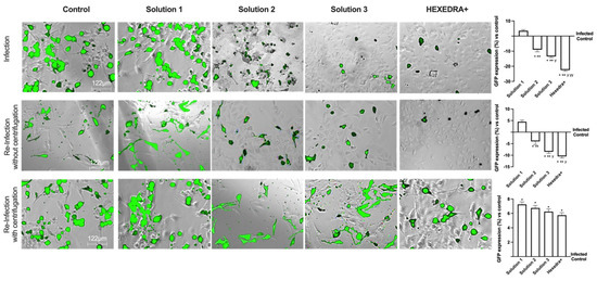 Based on the previous data, it is important to exclude that in the wells treated with Solution 2, Solution 3, and HEXEDRA+, the infection did not occur due to UA-mediated virus death (excluding direct viral biological function). The supernatants were used as they were (without centrifugation) to infect new Vero E6 cells, i.e., virgin cells lacking any previous stimulation (UA or infection). As reported in Figure 3, the infection picture changes and begins to outline the operational profile of UA. Indeed, the control is found to be infected, as in the previous condition, and the supernatant without centrifugation is able to infect the virgin Vero E6 indicating that a good deal of viral load remains in the supernatant to re-infect other cells. The supernatant of the infection in the presence of Solution 1 demonstrated that it has some viral load able to induce the infection (about 4.5% compared to control of re-infected cells, p < 0.05) with a great rate (about 22%) compared to the first infection (p < 0.05). On the contrary, for the stimulations with Solution 2, Solution 3, and HEXEDRA+, the supernatants collected after infection do not seem to be able to infect virgin cells. It is impossible to discern whether this is a biological effect of UA against the virus or whether the crosslinker of UA mixed with HPMC retains the virus for a long time. These data were confirmed by the GFP quantification of virgin Vero E6 cells that were not infected in all cases compared to the control (p < 0.05).