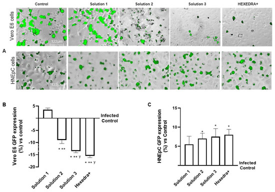 Conversely, the supernatant of cells pretreated with Solution 2, Solution 3, and HEXEDRA+ can infect virgin cells because the barrier effect exerted by the UA could hinder the entry of the virus into the cells by masking the specific receptor. Indeed, the virus remained trapped in the film formed by UA + HPMC and when the film was removed, the cells, which were washed, remained unacted on without the presence of UA. For this reason, it was possible to deduce that the viral activity remained intact without any alteration, as evidenced by the expression of GFP, which was visible after infection. Furthermore, infection with Vero E6 supernatant on HNEpC cells did not appear to be altered, thus ruling out the possibility of a possible virus–cell-specific receptor interaction. In summary, this work has shown that UA could trap viral particles and, more importantly, this ability is due to a mechanical rather than a biological effect.