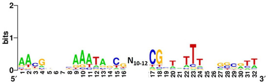 Using the DNA-binding sequence information from a set of FlhDC target sequences, a 42–44 bp palindromic sequence consisting of AAYGSSNNAAATAGCG-N10-12-CGCTATTTNNSSCRTT was proposed as the consensus recognition sequence for FlhDC [11,12,13,14]. As we obtained 49 new FlhDC-binding sites, the FlhDC consensus sequence was analyzed using the MEME program [25] to identify the FlhDC-box sequence in the newly targeted regions. We identified the same 42–44 bp sequence in 44 of the 55 FlhDC target regions (Table 1), and the high conservation of the A1, A2, G4, A9, A10, A11, T12, and A13 bases was also consistent (Figure 2) [12]. These results suggest that the novel target genes of FlhDC identified by the gSELEX screening was valid.