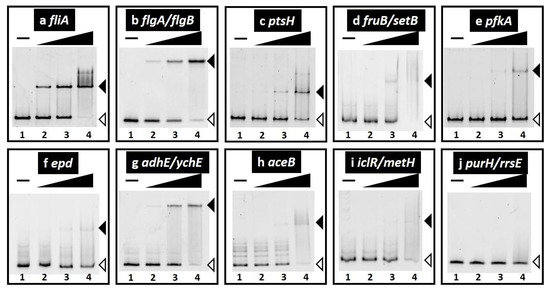 Gel shift assay of FlhDC–DNA complex formation. (a–j) Purified FlhDC was mixed with 0.1 pmol of each target DNA probe of the FlhDC-binding regions shown in Table 1 (also see Figure S2). FlhDC added: lane 1, 0 nM; lane 2, 10 nM; lane 3, 30 nM; lane 4, 100 nM. The filled triangles indicate the FlhDC–DNA probe complex, whereas open triangles indicate free probes.