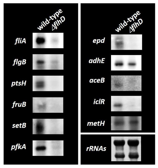 Northern blotting analysis of mRNAs from FlhDC target genes. Wild-type E. coli K-12 BW25113 and its flhD mutant JW1881 were grown in M9 0.2% glucose media. Total RNA was prepared during the exponential phase and subjected to Northern blotting analysis. DIG-labeled hybridization probes are shown on the left side of each panel. The amounts of total RNA analyzed were examined by measuring the intensity of ribosomal RNAs.
