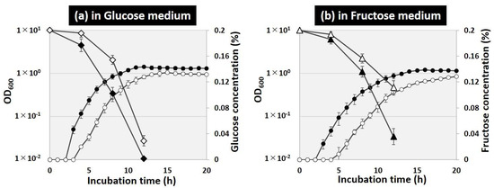 Effect of flhD deficiency on the growth curve and sugar consumption. E. coli BW25113 (closed symbols) and its flhD mutant JW1881 (open symbols) were grown in M9 media with 0.2% glucose (a) or 0.2% fructose (b). Cell density (circles in a,b) was monitored every hour and plotted along the time course. The concentrations of glucose (rhomboids in a) and fructose (rhomboids in b) were monitored every 4 h for up to 12 h.