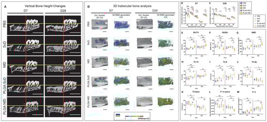 Representative 3D images of volume of interest (VOI) of the extraction socket in all groups are shown in Figure 1D. In the PLGA-NfD-treated rats, the bone volume fraction (BV/TV, %), bone mineral density (BMD, mg/cm3), trabecular thickness (Tb.Th, µm), trabecular number (Tb.N, per mm), and trabecular star volume (V*tr, mm3) were significantly increased on D7 compared with PBS-, ScD-, and PLGA-ScD-treated rats (Figure 1E–M; Table S2). Treatment with NfD also significantly increased the BMD and Tb.Th of the bone in the tooth-extraction socket compared with the ScD-treated rats and the NfD-, ScD-, and PBS-treated groups, respectively. In contrast, the bone surface ratio (BS/BV, per mm), trabecular separation (Tb.Sp, µm), trabecular spacing (Tb.Spac, µm), and bone marrow space star volume (V*m.space, mm3) upon PLGA-NfD treatment were significantly more decreased on D7 than on PBS-, ScD-, and PLGA-ScD-treated rats on the same day. NfD-treated rats had significantly reduced BS/BV and V*m.space compared with ScD- and PBS-treated rats, respectively. On D28, a similar tendency was observed in the PLGA-NfD-treated group, with significantly increased BV/TV, BMD, Tb.Th, Tb.N, and V*tr, but decreased BS/BV, Tb.Sp, Tb.Spac, and V*m.space, than in the control group. In contrast, no significant difference was observed between rats administrated NfD and PBS, which showed similar outcomes concerning the different features evaluated.