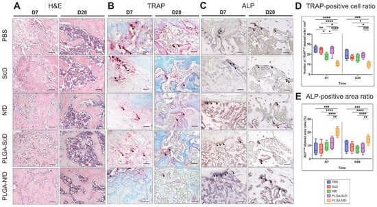Semi-quantitative analysis of the number of TRAP-positive osteoclasts on D7 showed that they were significantly decreased in the PLGA-NfD-rats group compared with the other groups (Figure 2D; Table S3). Furthermore, NfD-treated rats showed a significantly decreased number of TRAP-positive osteoclasts than those treated with PBS, ScD, and PLGA-ScD, but significantly increased when compared with the PLGA-NfD group. On D28, all groups showed more moderate TRAP expression than on D7. The PLGA-NfD group showed significantly lower values than the other four groups. A contradictory tendency was observed concerning ALP activity, with the PLGA-NfD group showing significantly increased ALP-positive tissues on D7 and D28 than the other groups (Figure 2E; Table S4).