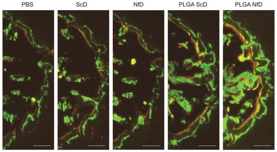 Treatment with ScD alone was one of the negative controls used in the current study; a similar experimental design has also been implemented in previous studies [,,,]. Herein, treatment with ScD and PLGA-ScD exhibited results identical to the vehicle control (PBS) in all analyses. Although previous research reported a therapeutic effect of PLGA in the extraction socket concerning the alveolar bone height, in the present study, the NfD group shared identical tendencies with the other groups (except PLGA-NfD) in almost all D7 analyses. On D28, the NfD treatment showed diminished effects, similar to that of the other groups except for PLGA-NfD treatment. These results indicate the necessity of PLGA as a vector to achieve a therapeutic effect, which indirectly proves the distinctive effects of PLGA loaded with NfD. According to previous meta-analyses, tooth extraction always triggers a process of bone resorption [,,], in which the alveolar ridge undergoes progressive atrophy that is more noticeable in the apico-coronal dimension. The present findings demonstrate that PLGA-NfD administration can facilitate the maintenance of alveolar bone height. Furthermore, PLGA-NfD treatment can promote sustainable effects, as indicated by positive changes in the trabecular bone parameters following tooth loss. Morphological findings determined by microcomputed tomography demonstrated the preservative effects of PLGA-NfD, with inhibition of bone resorption not only in short term but also in remodeling periods.