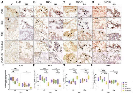 Immuno-histomorphometric analyses showed positive staining for interleukin (IL)-1β, and tumor necrosis factor (TNF)-α was mainly observed in inflammatory infiltrates in the intramedullary area of the newly formed trabecular bone (Figure 4A,B). Positive staining for transforming growth factor (TGF)-β1 was observed in the endothelial and fibroblast-like cells, and positive staining for receptor activator of nuclear factor-kappa B ligand (RANKL) was observed in the osteoblastic lining cells closer to the alveolar bone (Figure 4C,D). On D7 and D28, the inflammatory reaction was reduced in PLGA-NfD-treated rats, which was demonstrated by a decrease in the ratio of IL-1β and TNF-α levels (Table S5). Decreased bone resorption was observed by reduced RANKL expression. In contrast, promotion of bone formation was also observed with increased expression of TGF-β1. In NfD-treated rats, significantly decreased expression of IL-1β and RANKL was observed on D7, whereas the expression of the other evaluated molecules was similar to that in PBS, PLGA-ScD, and PLGA-NfD groups on D7 and D28 (Figure 4E–H).