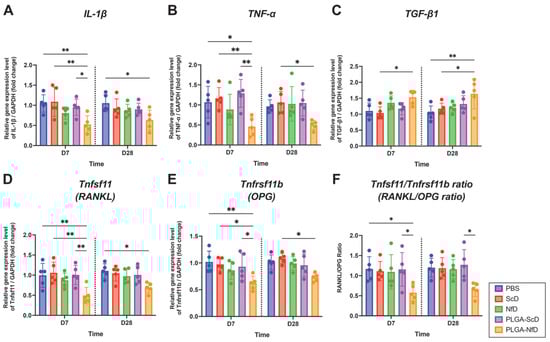 Biochemical analysis of the relative gene expression of IL-1β and TNF-α confirmed that treatment with PLGA-NfD prevented early inflammation, with reduced levels of Il1b and Tnf on D7 compared with the PBS, ScD, and PLGA-ScD groups (Figure 5A–F, Table S6). On D28, PLGA-NfD caused a significant decrease in Il1b expression compared with PBS alone, whereas the same significant difference was also found in Tnf expression upon treatment with ScD. Regarding osteoclastic-activity-related genes, Tnfsf11 and Tnfrsf11b were found to be significantly decreased in PLGA-NfD-treated rats than on D7 upon PBS, ScD, and PLGA-ScD treatment. On D28, PLGA-NfD-treated animals showed significantly decreased Tnfsf11 expression compared with PBS alone, whereas the same significant difference was also observed in Tnfrsf11b expression upon ScD treatment. RANKL/OPG (osteoprotegerin) (Tnfsf11/Tnfrsf11b) ratio in the PLGA-NfD group was significantly decreased compared with that in the PLGA-ScD group on D7; however, no significant difference was observed on D28. Regarding osteogenesis-related genes, the relative Tgfb1 expression was increased in PLGA-NfD rats on both D7 and D28 compared with that in ScD-treated rats. In contrast, on D28, a significantly increased expression of Tgfb1 was also observed upon PLGA-NfD treatment compared with PBS alone.