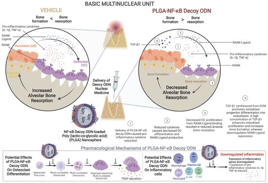 Pathogenic stimulus, such as those from bacterial infections, in the beginning of and during socket healing are one of the most common reasons for early excessive inflammation and alveolar bone loss driven by immune response apart from traumatic inflammation []. This local bone loss was reported to be partly mediated by inflammatory infiltrates, including neutrophils, lymphocytes, plasma cells, and macrophages, which subsequently regulate the balance and survival of osteoclasts and osteoblasts (Figure 6). In the present study, increased levels of IL-1β and TNF-α in the PBS, ScD, and PLGA-ScD groups illustrated that intervention with these solutions did not suppress the normal physiological healing process, which begins with the inflammatory phase. Previous studies defined the basic multicellular unit (BMU) as a balance between bone resorption and formation, including osteoclasts and osteoblasts [,,]. Based on the pharmacological mechanism of NfD, it can be inferred that the balance of bone resorption and formation might have been altered because of the decoy effect of NF-κB during the healing process of the alveolar socket. A previous in vitro study showed the selective NfD uptake into monocytes/macrophages, leaving other cells, such as the stromal and osteoblast cells, unaltered. Hence, the effect of NfD was entirely confined to osteoclasts and their progenitor cells, causing reduced migration of osteoclast precursor cells [,]. Based on previous correlated in vitro research and our in vivo immunohistochemical and biochemical results, the therapeutic mechanism of NfD may be explained by the downregulation of the expression and secretion of proinflammatory cytokines (IL-β and TNF-α) in and by inflammatory cells, which resulted in reduced stimulation toward the differentiation of osteoclast precursors and consequently reduced activation of mono- and multi-nucleated osteoclasts and polarized resorbing osteoclasts. In addition, because of the intracellular uptake by endocytosis of PLGA-NfD, downregulation of the expression of downstream osteoclastogenic genes, such as NFATC1 and TRAP, in osteoclast precursors may also be triggered by PLGA-NfD, which directly hinders their differentiation and consequently causes a significant reduction in the number of these cells, also affecting normal stromal cells, osteoblasts, and osteocytes and reducing osteoblastic RANKL expression (Figure 6). Consequently, the decrease in RANKL production in the BMU can generate an environment of attenuated inflammation, causing the inhibition of RANKL activation and thereby preventing bone resorption. Interestingly, we found that the decoy ODN alone can downregulate the levels of inflammatory cytokines, which leads to reduced osteoclastic activity. In the current study, NfD-treated rats on D7 and PLGA-NfD-treated rats on D7 and D28 had increased levels of TGF-β1, which suggests an osteogenic tendency in socket healing. TGF-β1 is known as an immunoregulatory cytokine and bone-derived factor in osteoimmunology; however, when at a high concentration it can enhance osteoblast proliferation and downregulate RANKL expression in osteoblasts [,]. This also accounts for the reduced expression of RANKL in the present study. In other treatment groups that presented a lower TGF-β1 expression, osteoclast maturation was facilitated and, even though TGF-β1 expression increased via its normal physiological mechanism, the potential of bone formation still could not reach the same level as bone resorption on D28.
