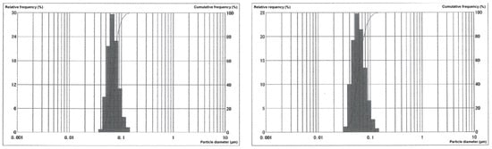 Particle size distribution of the PLGA-NfD (left) and PLGA-ScD (right) nanospheres evaluated by DLS method. The histogram indicates the relative frequency and the black line represents the cumulative distribution frequency as the particle count-basis.