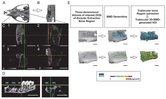 Assessment of 3D microcomputed tomography images of the maxillary extraction socket. Volume of interest (VOI) in the images of the extraction socket used for analysis is shown. (A,B) 3D microcomputed tomography scan of the extraction socket. (C) Reference plane: first, the mid-palatal suture plane of the maxillary left hemimaxilla in transverse view (C1, green line) was aligned, and then the hard palate referenced by the maxillary palatal plane of the sagittal view (C2, red line) and the coronal (C3, green line) planes were determined. The VOI was determined including the whole socket area by the border of the line of the M3 cement–enamel junction (C4, red dotted line) and the line of height of contour of M2 (C4, yellow dotted line). After the determination of VOI (C1-4), the VOI of the extraction socket was generated in a cuboidal volume (LX: 2.5 mm, LY: 2.2 mm, and LZ: 4.6 mm) (Scale bar = 4 mm). (D) Different aspects (left, parasagittal; right, frontal) of linear measurement of the buccal, middle, palatal, mesial, and distal enclosing the extraction socket area were evaluated as vertical height loss (scale bar = 1 mm). (E) Representative 3D images of the VOI of the extraction socket. Trabecular bone structures of the socket were extracted and reconstructed into a 3D image. After BMD generation, trabecular bone parameter measurements were conducted using the trabecular 3D-BMD-generated VOI. BMD value was reflected in the BMD color transition scale shown below (scale bar = 1 mm). Abbreviations: BMD, bone mineral density; HBL, buccal height loss of extraction socket; HD, distal height loss of extraction socket; HM, mesial height loss of extraction socket; HML, middle height loss of extraction socket; HPL, palatal height loss of extraction socket.