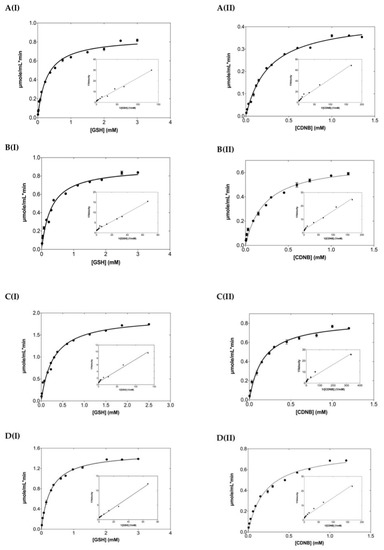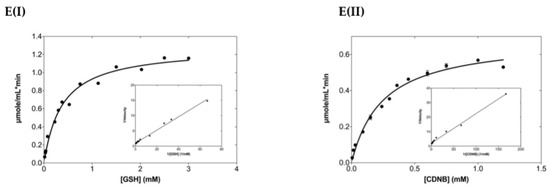 GST assays were performed by measuring the conjugation reaction between CDNB (1 mM) and GSH (2.5 mM) at 340 nm (ε = 9.6 mM−1·cm−1), 37 °C, and pH 6.5, as previously described [28]. Steady-state kinetic analysis for the kinetic parameters’ determination was carried out at pH 6.5 and 37 °C using GSH and CDNB as substrates. Reaction rates were corrected for non-enzymic rates. For the determination of Km for GSH, the concentration of CDNB was kept at 1 mM, while GSH was varied (0.015–3 mM). For the determination of Km for CDNB, the concentration of GSH was kept at 2.5 mM, and the concentration of CDNB was varied (0.006–1.350 mM). Typical measurements for the steady-state kinetics plot were carried out in triplicate, with maximum deviations from the mean value of 10%. Curve-fits were obtained using the GraphPad (GraphPad Software Inc., San Diego, CA, USA, Version 7.00) computer program.