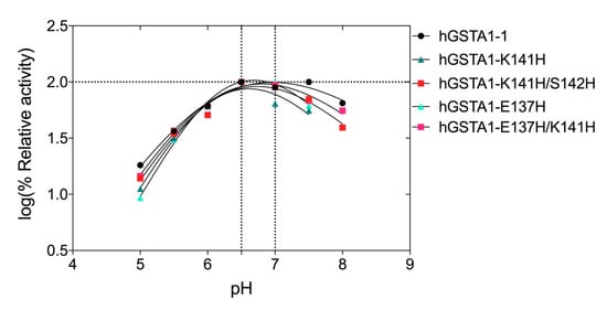 The dependence of the enzyme activity on pH for the wild-type and the mutant enzymes was assessed over the pH range 4–9, and the results are shown in Figure 4. The results indicate that the mutations do not significantly affect the optimal pH activity of hGSTA1-1, which is in the range of 6.6–6.9 at 37 °C (Figure 4). Below pH 6 and above pH 7, the enzyme activity is strongly diminished.