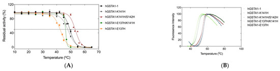 DSF is widely used as a method to estimate both the folding state and thermal stability of proteins [32]. The temperature-induced unfolding profiles of the wild-type and mutants were studied by measuring the corresponding changes in fluorescence emission upon temperature increase (Figure 5B). The unfolding profiles of the enzymes exhibited a single peak with maximum fluorescence intensity, corresponding to Tm values. The results showed that the mutants hGSTA1-E137H and hGSTA1-K137H/S141H display lower Tm values, whereas the Tm values for hGSTA1-K141H and hGSTA1-K141H/S142H are almost identical to that determined for the wild-type enzyme (Table 4).