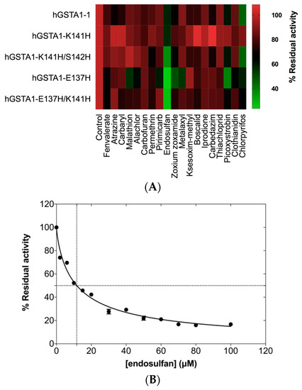 (A) Screening of inhibition potency of selected pesticides (25 μΜ) against the wild-type enzyme and its mutants. The inhibition was evaluated by measuring GST catalytic activity using GSH-CDNB as substrate system, in the presence of 25 μΜ of pesticide for a period of 2 min. In the absence of pesticides, enzyme activity was taken as 100%. Experiments were performed in triplicate, and the reported values in the heat map correspond to the mean value. (B) Concentration–response curve for endosulfan. IC50 value for hGSTA1-K141H/S142H was determined using GraphPad Prism. GST activity was assayed using the CDNB–GSH assay system in triplicate (standard errors are depicted).